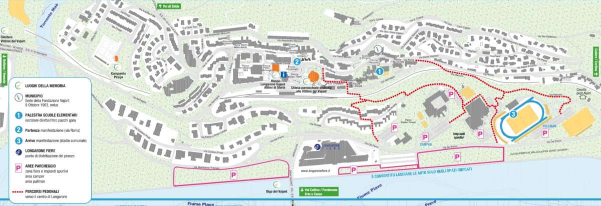 Parcheggia la tua auto negli spazi appositamente dedicati in zona impianti sportivi/Palafiere. Potrai accedere alla zona di partenza nel centro di Longarone attraverso gli appositi percorsi pedonali segnalati. In ogni caso il personale di servizio sarà a disposizione per le indicazioni. Assicurati di avere con te abbigliamento, calzature e attrezzatura adatti per una camminata su sentieri di montagna, strade sterrate e terreni scivolosi, anche in caso di pioggia. Nello scegliere il tracciato che vorrai percorrere, tieni presente che non è disponibile il servizio del bus navetta, quindi valuta con attenzione se intraprendere il percorso della 16 km o della 24 km. Indossa il braccialetto che ti verrà consegnato alla partenza per facilitare i controlli lungo il tracciato. In particolare in località Vajont, dopo il ponte Campelli, sarà fatto un controllo accurato per garantire l’accesso ai soli iscritti alla manifestazione. Visto il particolare valore morale e civile della manifestazione, ti chiediamo di aiutarci a mantenere in ordine i Luoghi della Memoria evitando di abbandonare rifiuti lungo il percorso. È inoltre proibito bere alcolici prima e durante la manifestazione. È assolutamente vietato correre o superare gli altri partecipanti sul coronamento della diga e sui tratti di sentiero stretti, ripidi e/o strapiombanti. Lungo i tracciati ci sarà del personale di sicurezza a disposizione per eventuali informazioni o richieste. In caso di incolonnamenti lungo i tratti di percorso su strada, procedi con ordine e attenzione, assicurati di rispettare i segnali presenti e di non oltrepassare i limiti del percorso indicato (sentieri, strade bianche, tratti di carreggiata delimitati dai birilli). Se ti capita di incontrare persone in difficoltà, aiutaci a prestare loro soccorso segnalandole agli assistenti lungo i percorsi e agevolando le operazioni di intervento. La partenza è libera dalle ore 8.30 alle ore 10.00. Lungo il tracciato sono stati predisposti dei cancelletti di controllo. Assicurati di rispettarne gli orari di chiusura e di non rimanere indietro. Pont de le Roste (Loc. Vajont – Cava dei Pascoli) ore 10:30 Coronamento della diga del Vajont ore 12:30 Erto ore 12:30 Casso ore 13:30 Codissago ore 14:30 Chiusura della manifestazione e assistenza lungo i percorsi ore 15:00 Nei punti panoramici o particolarmente esposti, se vuoi scattare una foto o osservare il paesaggio, evita di sporgerti, assicurati di mantenere una posizione di sicurezza e di non superare i parapetti stradali dove presenti. Ti chiediamo inoltre di non soffermarti troppo ai punti di ristoro, per evitare affollamenti. L’organizzazione declina ogni responsabilità per incidenti e danni che dovessero verificarsi a cose e persone nel corso della manifestazione. Ogni iscritto dovrà dichiarare un numero telefonico di riferimento al fine di permettere un eventuale contatto in caso di ricerca o emergenza.